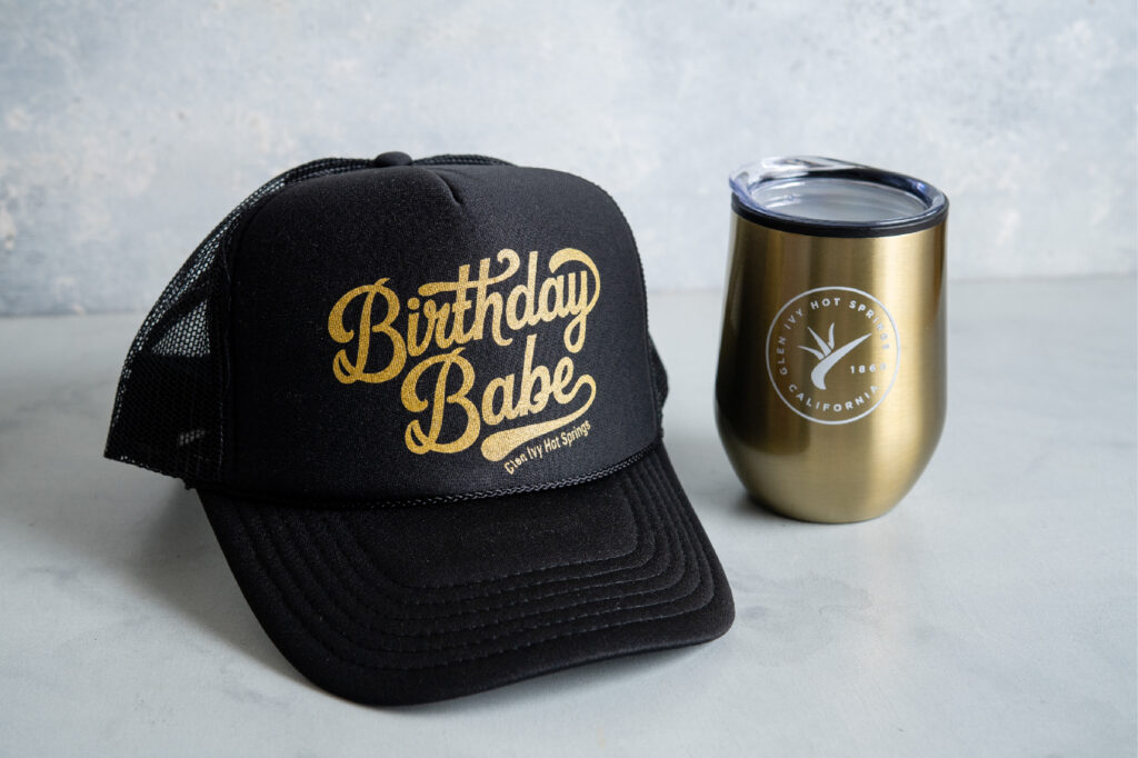 Make your birthday at Glen Ivy Hot Springs even more special with our Birthday Celebration Bundle! For an additional $49 per person, you’ll receive a Glen Ivy Hot Springs hat, a wine tumbler, a glass of champagne or premium wine, and a delicious dessert. This bundle is the perfect addition to any Admission or package and can be booked by phone or online. Pick up your bundle at the Spa Lifestyle Store on the day of your visit and enjoy the celebration! Select Admission with Activity, Admission with Service, or any specialty package, to easily add the Birthday Celebration Bundle and make your day even more memorable.